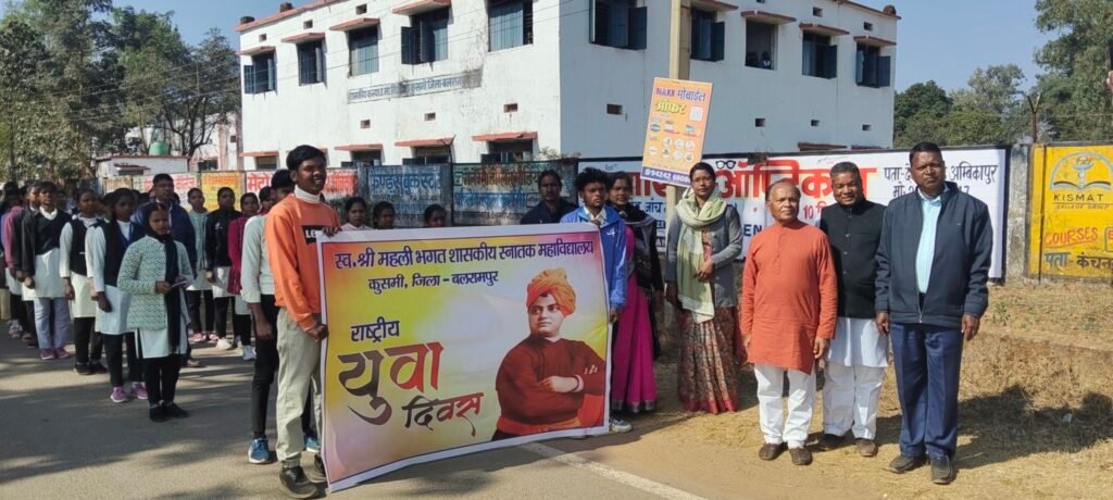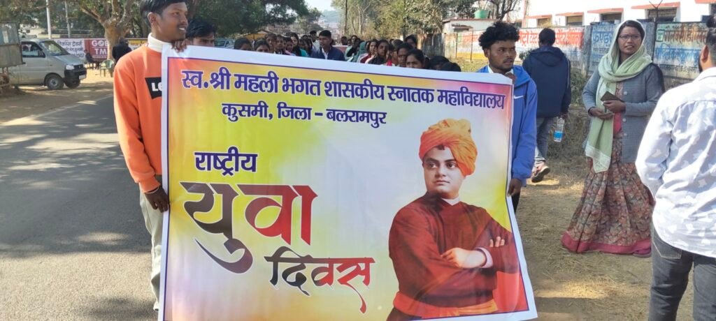 कुसमी। बलरामपुर जिले की नगर पंचायत कुसमी में आज श्री महली भगत महाविद्यालय के छात्र–छात्राओं द्वारा राष्ट्रीय युवा दिवस के अवसर पर भव्य जुलूस निकाला गया। यह आयोजन महान विचारक, युगप्रवर्तक और युवाओं के प्रेरणास्रोत स्वामी विवेकानंद की जयंती के उपलक्ष्य में किया गया।