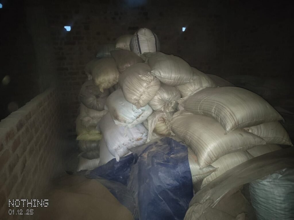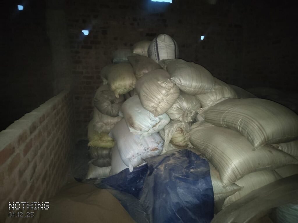 अम्बिकापुर 02 दिसम्बर 2025/ जिले में अवैध धान परिवहन एवं भंडारण के खिलाफ जिला प्रशासन द्वारा ताबड़तोड़ कार्रवाई की जा रही है। सोमवार को मैनपाट विकासखण्ड के सपनादर के गुलाब यादव के घर से 70 बोरी 28 क्विंटल तथा कमलेश्वरपुर के श्याम यादव के घर से 60 बोरी 24 क्विंटल जप्त कर मण्डी अधिनियम के तहत कार्यवाही की गई है