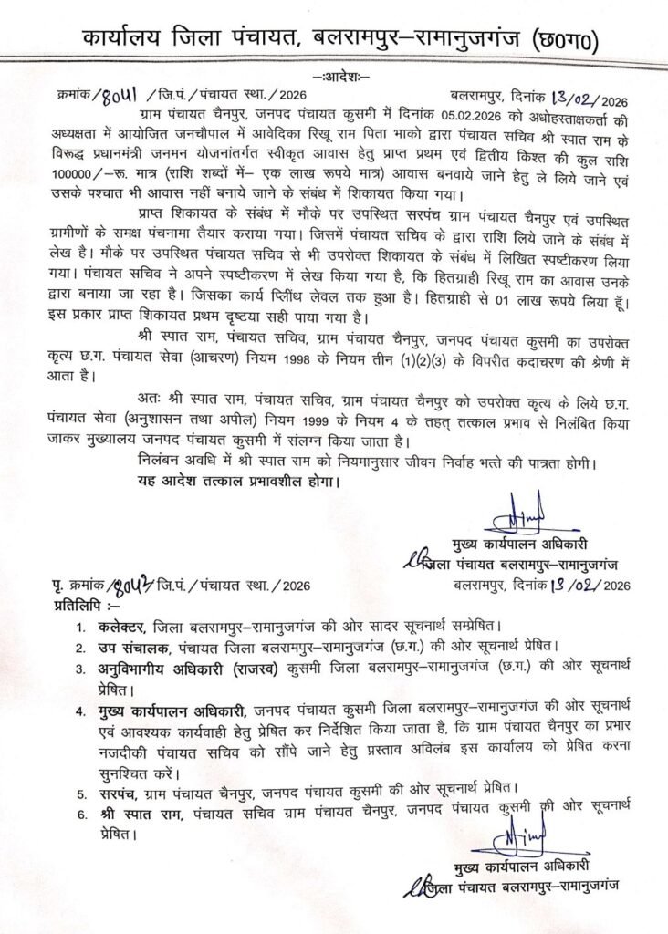 बलरामपुर,,जनचौपाल में प्राप्त शिकायत पर की गई कार्रवाई चैनपुर के पंचायत सचिव स्पात राम निलंबित।