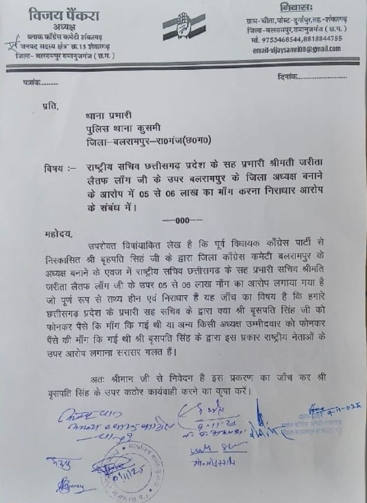 इसी मुद्दे को लेकर कांग्रेस जिला अध्यक्ष और कुसमी ब्लॉक कांग्रेस कमेटी के पदाधिकारियों ने कुसमी थाने में शिकायत दर्ज कर कार्रवाई की मांग की है। कार्यकर्ताओं का कहना है कि ऐसे आरोप पार्टी की साख को नुकसान पहुँचाते हैं और मामले की निष्पक्ष जांच जरूरी है।