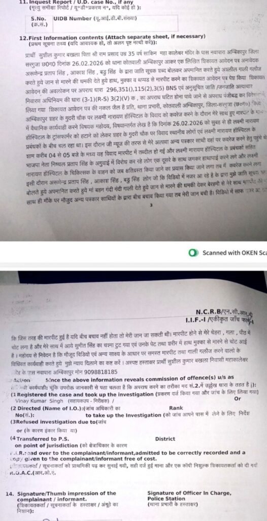 अंबिकापुर,, पत्रकार से मारपीट: FIR दर्ज, गिरफ्तारी नहीं – प्रदेश स्तरीय आंदोलन की चेतावनी।