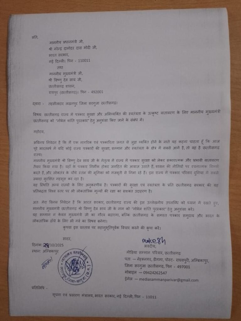 पत्रकार सुरक्षा, अभिव्यक्ति की स्वतंत्रता और लोकतांत्रिक मूल्यों के सशक्त संरक्षण के क्षेत्र में छत्तीसगढ़ राज्य द्वारा किए जा रहे उल्लेखनीय कार्यों के प्रति आभार प्रकट करते हुए पत्रकार मुकेश कुमार (पंचायती न्यूज़) ने तहसीलदार लखनपुर के माध्यम से एक महत्वपूर्ण ज्ञापन सौंपा। इस ज्ञापन में उन्होंने माननीय मुख्यमंत्री श्री विष्णु देव साय जी को “नोबेल शांति पुरस्कार” हेतु अनुशंसा किए जाने की मांग रखी है।