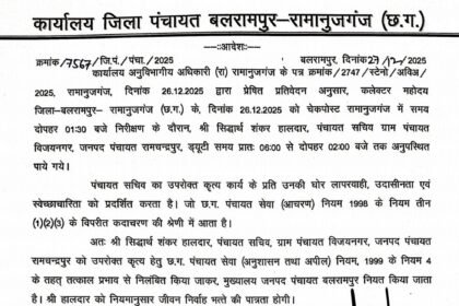संपादक जसीम खान संवाद छत्तीसगढ़ न्यूज़ कुसमी बलरामपुर/9111740798 अनुशासनहीनता पर पंचायत सचिव…