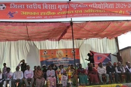 कुसमी,,कुसमी में जिला स्तरीय बिरसा मुंडा फुटबॉल प्रतियोगिता का समापन, अतिथियों का हुआ भव्य स्वागत।