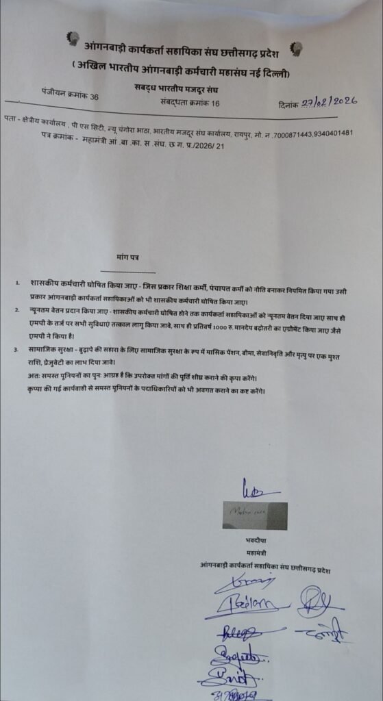अतः उड़ीसा के पूरी में 6 से 8 फरवरी 2026 को आयोजित आरतीय मजदूर संघ के अखिल भारतीय अधिवेशन के माध्यम से हम केंद्र तथा राज्य सरकारों से संयुक्त रूप से यह मांग करते हैं की उपर्युक्त लिखित विषय बिंदुओं के प्रकाश में सरकार तथा आंगनबाड़ी कर्मियों के मध्य कर्मचारी तथा नियोक्ता का संबंध स्थापित स्पष्ट स्थापित होता है तथा यह वैधानिक पद पर कार्य कर रही है, वेतन भुगतान अधिनियम 1936 तथा ग्रेजुएटी. एक्ट 1972 इन पर लागू होता है. तथा सामाजिक सुरक्षा प्रदान करने की भी सिफारिश की गई है, इसलिए आंगनबाड़ी कर्मियों को कर्मचारी घोषित करते हुए वेतन एवं सामाजिक सुरक्षा का लाभ इन्हें अविलंब प्रदान किया जाए।
