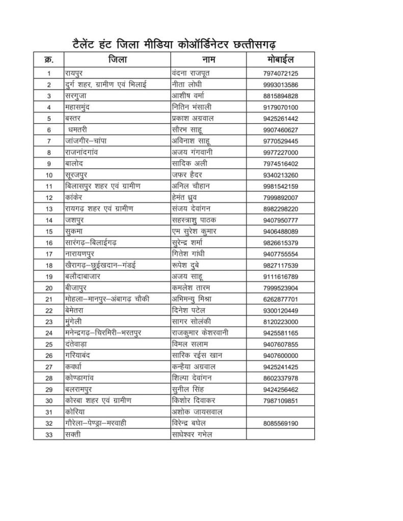 अखिल भारती कांग्रेस कमेटी संचार विभाग द्वारा पूरे देश में नेशनल टैलेंट हंट कार्यक्रम का आयोजन किया जा रहा है। इसकी औपचारिक शुरुआत प्रदेश कांग्रेस कमेटी के अध्यक्ष दीपक बैज ने की है। कार्यक्रम के लिए प्रदेश स्तर, जोन (संभाग ) स्तर एवं जिला स्तर पर कार्यक्रम को चलाने के लिए समन्वयक नियुक्त किए गए है। पूरे प्रदेश को पांच जोन में बांटा गया है और जोन स्तर पर भी प्रभारी नियुक्त कर दिए गए हैं। प्रदेश स्तरीय कमेटी के संयोजक संचार विभाग प्रमुख सुशील आनंद शुक्ला और सहायक के रूप में वरिष्ठ प्रवक्ता धनंजय ठाकुर, सोशल मीडिया इंचार्ज मनी वैष्णव रहेंगे। आवेदन के लिए स्कैनर जारी कर दिया गया है जिसके जरिए सभी प्रतिभागी ऑनलाइन आवेदन कर सकते हैं। चयन के लिए तय मापदंड में कहा गया है कि कांग्रेस के मूल्यों के प्रति निष्ठा स्पष्ट सोच एवं त्वरित प्रतिक्रिया और संचार कौशल इतिहास का समुचित ज्ञान के साथ राजनीतिक जानकारी होनी चाहिए।