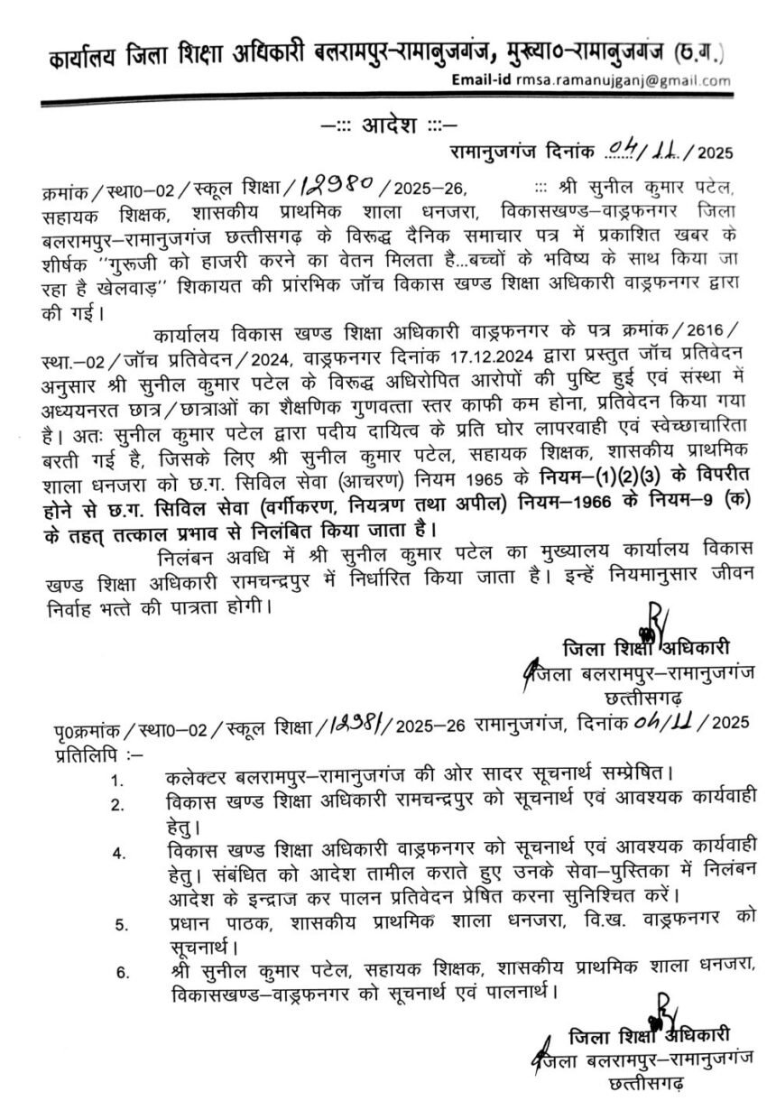 पदीय दायित्व के प्रति घोर लापरवाही एवं स्वेच्छाचारिता बरतने पर सहायक शिक्षक निलंबितसंवाद छत्तीसगढ़ न्यूज़ कुसमी/बलरामपुर 05 नवम्बर 2025/ सहायक शिक्षक श्री सुनील कुमार पटेल शासकीय प्राथमिक शाला धनजरा, विकासखण्ड…