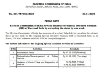 भारत निर्वाचन आयोग ने मतदाता सूचियों के विशेष गहन पुनरीक्षण (एसआईआर) की तिथि एक सप्ताह और बढ़ाई।