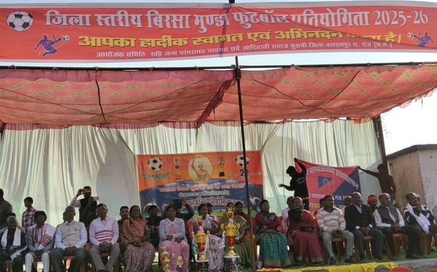 जिसमें कुसमी थाना प्रभारी विरासत कुजूर,और थाना कुसमी उप निरीक्षक दीपक बाड़ा मौजूद रहे। बालरामपुर ज़िले के कुसमी विकासखंड में आयोजित जिला स्तरीय “बिरसा मुंडा फुटबॉल प्रतियोगिता” का आज भव्य समापन समारोह आयोजित किया गया। प्रतियोगिता के समापन अवसर पर मुख्य अतिथि के रूप में रहीं जिला पंचायत सदस्य हीरा मुनि निकुंज , जबकि विशिष्ट अतिथि के रूप में जनपद अध्यक्ष बसंती भगत और मंडल अध्यक्ष शशि टोप्पो मौजूद रहीं माधुरी लकड़ा,,हीरामणि प्रजापति।