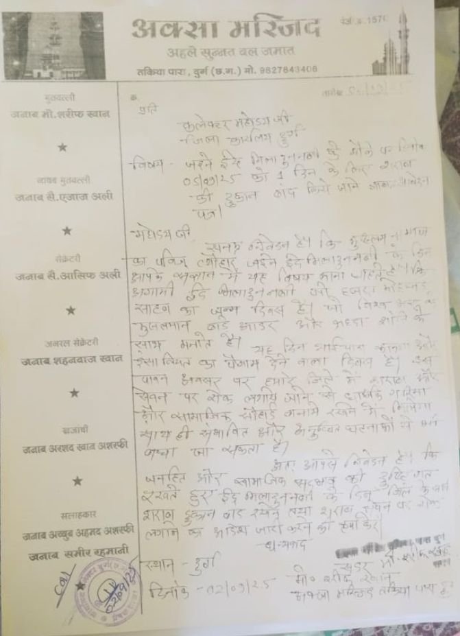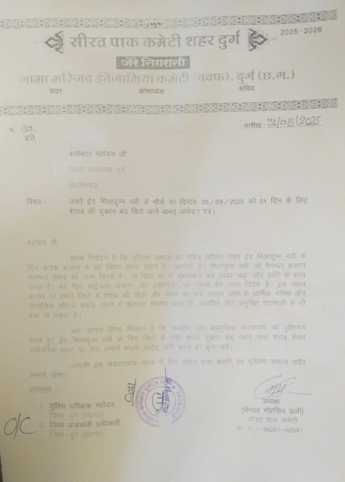 यह ज्ञापन कलेक्टर को सौंपा गया, जिसमें शराब की बिक्री और सेवन पर पूर्ण प्रतिबंध लगाने की मांग की गई है, विशेष रूप से धार्मिक त्योहारों के दौरान। रजा यूनिटी फाउंडेशन दुर्ग लंबे समय से सामाजिक सुधार और एकता को बढ़ावा देने वाले कार्यों में सक्रिय है।