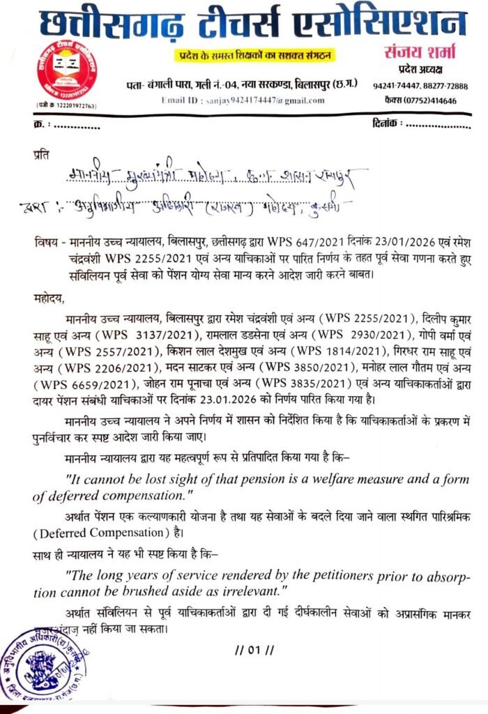 ब्लॉक अध्यक्ष दीपक सिन्हा ने बताया कि माननीय उच्च न्यायालय द्वारा दिनांक 23.01.2026 को WPS 647/2021 एवं अन्य याचिकाओं पर महत्वपूर्ण निर्णय सुनाया गया है। कोर्ट ने स्पष्ट टिप्पणी की है कि संविलियन से पूर्व शिक्षकों द्वारा दी गई दीर्घकालीन सेवाओं को ‘अप्रासंगिक’ (Irrelevant) मानकर नजरअंदाज नहीं किया जा सकता। न्यायालय ने पेंशन को एक “कल्याणकारी उपाय” (Welfare Measure) और “स्थगित पारिश्रमिक” बताते हुए राज्य शासन को निर्देशित किया है कि वह सेवा की निरंतरता, कर्तव्यों की प्रकृति और समानता के अधिकार को ध्यान में रखते हुए पुनर्विचार करे और आदेश जारी करे।