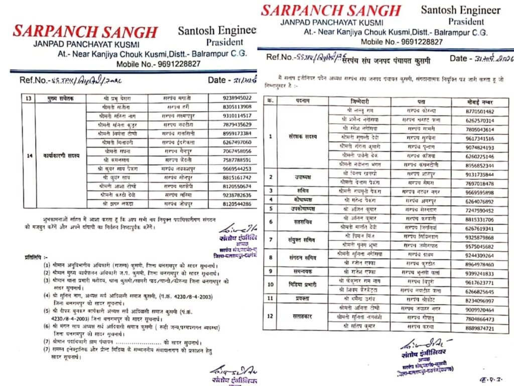 सरपंच संघ जनपद पंचायत कुसमी की कार्यकारिणी का गठन कर दिया गया है। सरपंच संघ अध्यक्ष श्री संतोष इंजिनियर ने आज महावीर जयंती के शुभ अवसर पर इसकी घोषणा की।