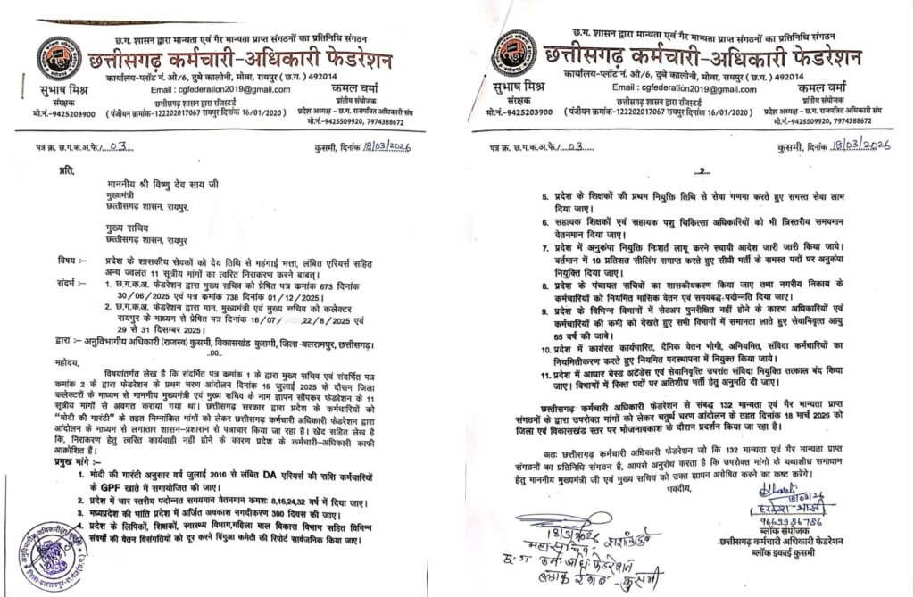 छत्तीसगढ़ सरकार द्वारा प्रदेश के कर्मचारियों को मोदी की गारंटी के तहत निम्नलिखित मांगों को लेकर छत्तीसगढ़ कर्मचारी अधिकारी फेडरेशन द्वारा आंदोलन के माध्यम से लगातार शासन प्रशासन से पत्राचार किया जा रहा है खत सहित लेख है कि निराकरण हेतु त्वरित कार्यवाही नहीं होने के कारण प्रदेश के कर्मचारी अधिकारी काफी आक्रोशित हैं
