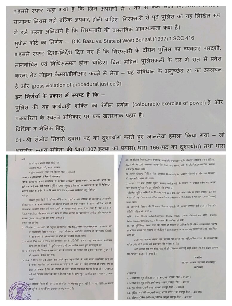 शिकायत के अनुसार, घटना के बाद 09 अक्टूबर की रात 1:37 बजे पुलिस ने पत्रकार मनोज पांडे के घर का गेट तोड़कर प्रवेश किया, महिला पुलिसकर्मी की अनुपस्थिति में तलाशी ली और कैमरा व डीवीआर ज़ब्त किए। इसे संविधान के अनुच्छेद 21 और सुप्रीम कोर्ट के निर्देशों का उल्लंघन बताया गया है।