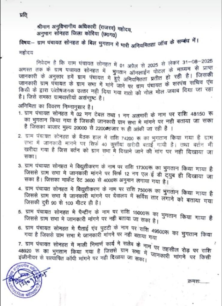 पंचों ने ये भी बताया कि 01 04 2025 से लेकर 31-08-2025 अगस्त तक के ग्राम पचायत सोनहत में भुगतान ऑनलाईन पोटल के माध्यम से जानकारी मिली जानकारी के अनुसार ग्राम पंचायत सोनहत मे अनियमितता प्रतीत हो रही है।