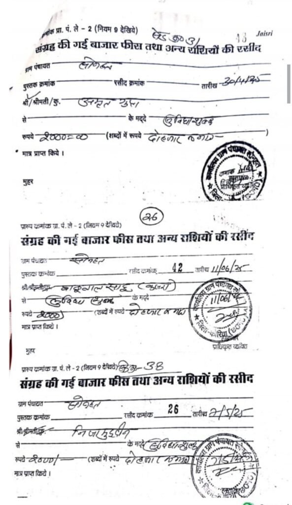 . ग्राम पंचायत सोनहत को बाजार बैठकी का राशी 45000 रू जयकरन साहु के द्वारा सरपंच पति एंव उपसरपंच को दिया गया जिसकी लिखित जानकारी ग्राम पंचायत सोनहत में नहीं है
