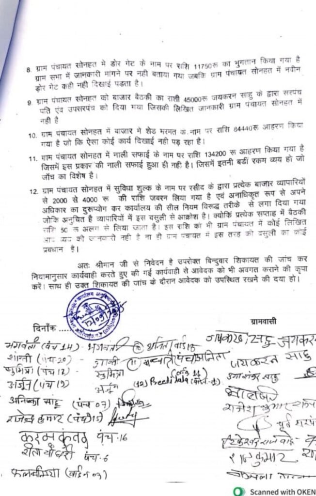 सोनहत मुख्यालय पंचायत में सरपंच /सचिव के खिलाफ पंचायत के 12 सदस्यों ने एसडीएम सोनहत को ज्ञापन सौंपकर कई आरोप लगाए। इनमें वित्तीय अनियमितताएं, विकास कार्यों में लापरवाही और पद का दुरुपयोग करने की बात शामिल है। पंचो ने अनुविभागीय अधिकारी से निष्पक्ष जाँच की मांग की है