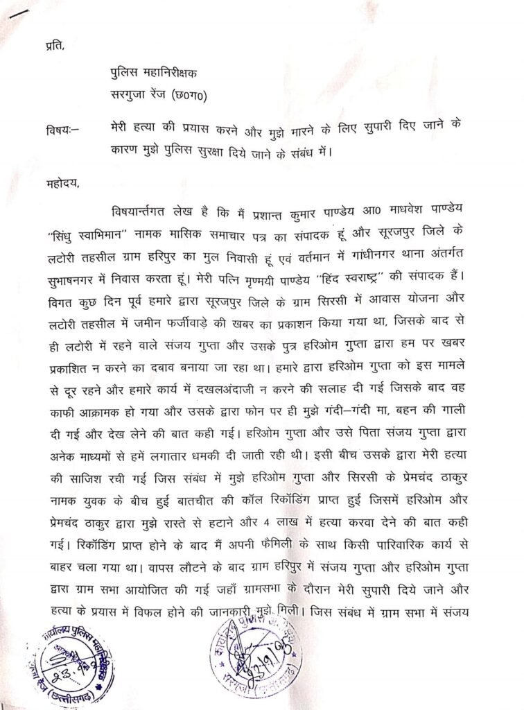 पत्रकार प्रशान्त पाण्डेय की हत्या की साजिश रचने वाले भ्रष्ट तंत्र का पर्दाफाश — आईजी सरगुजा रेंज से शिकायत, सुरक्षा की मांग